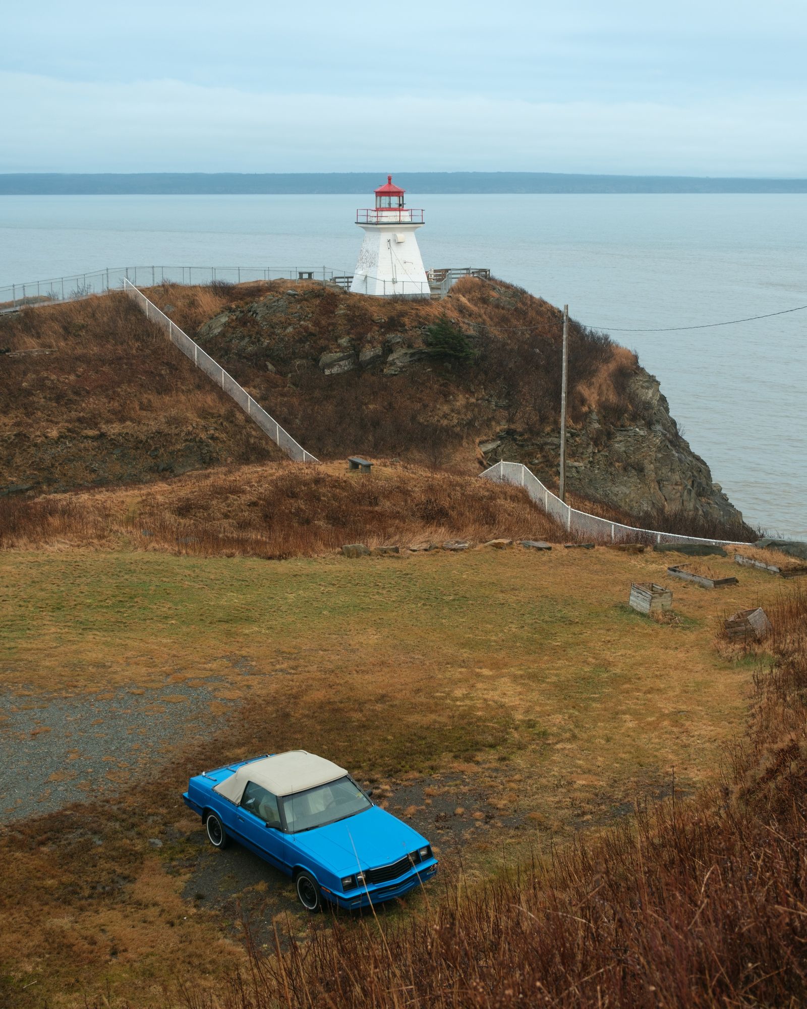 Vintage car and Cape Enrage Lighthouse, New Brunswick, Canada