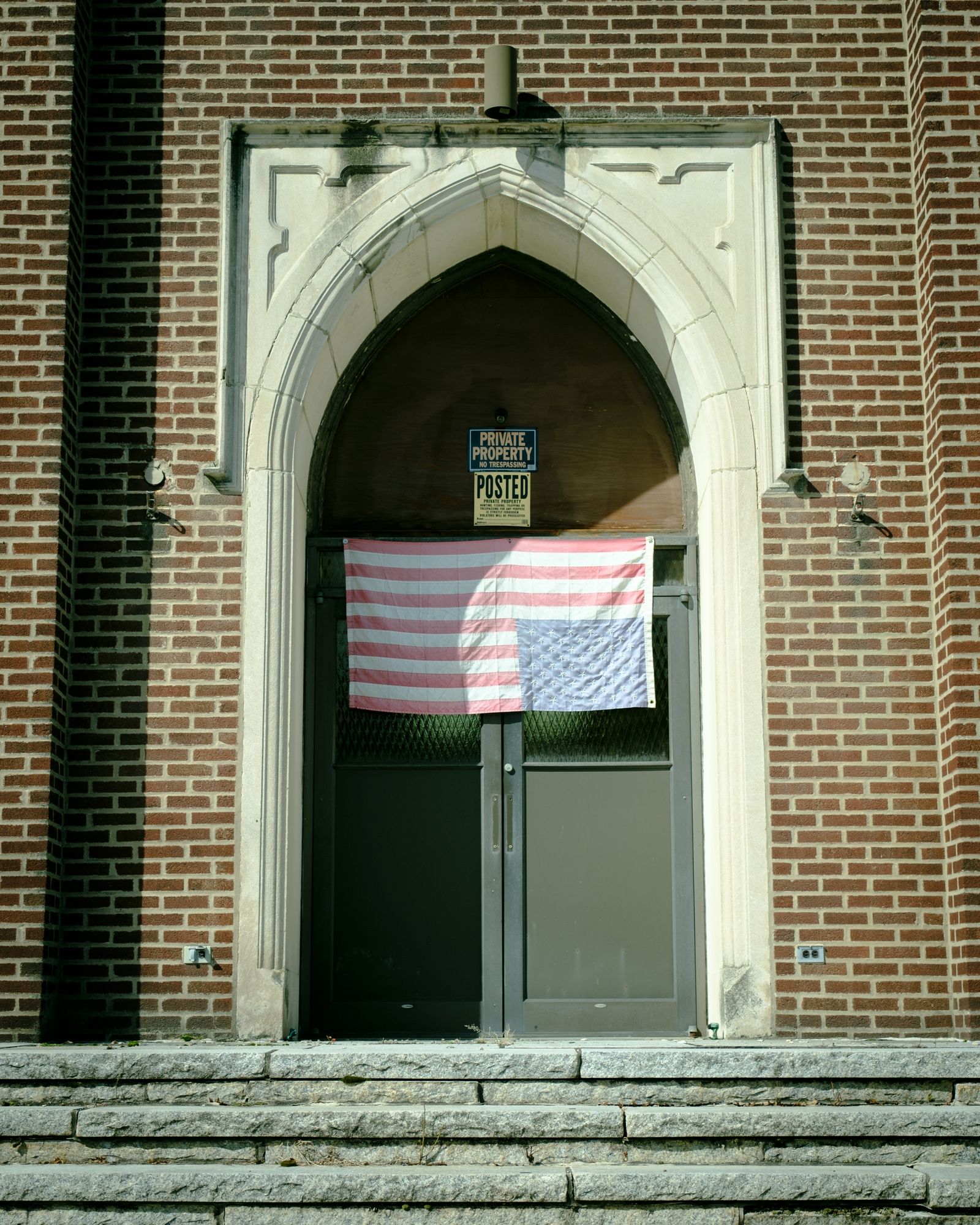Upside-down American flag on St. Mary of Assumption Church, Coaldale, Pennsylvania