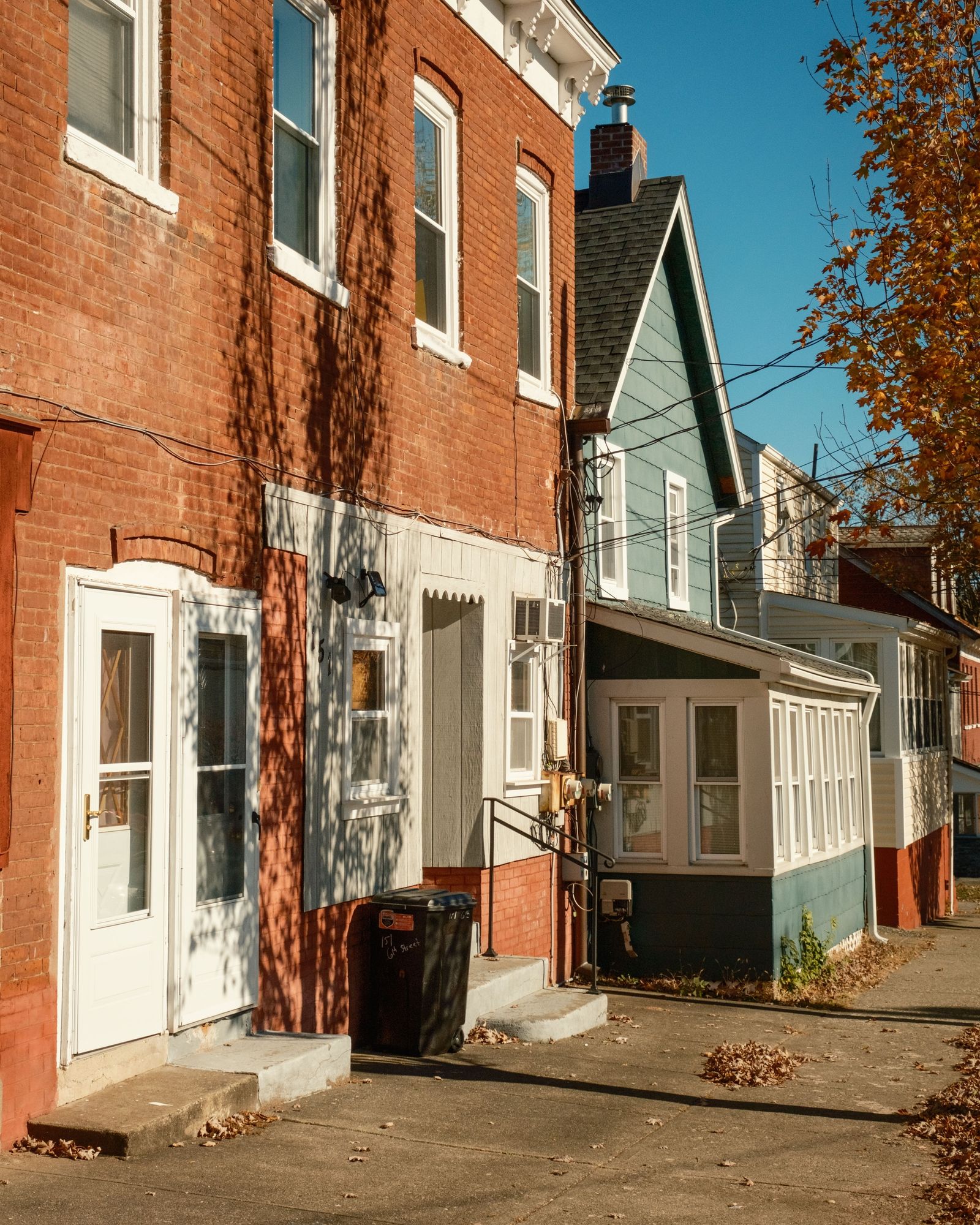 Row of houses with brick and wooden exteriors bathed in afternoon light, Verplanck, New York.