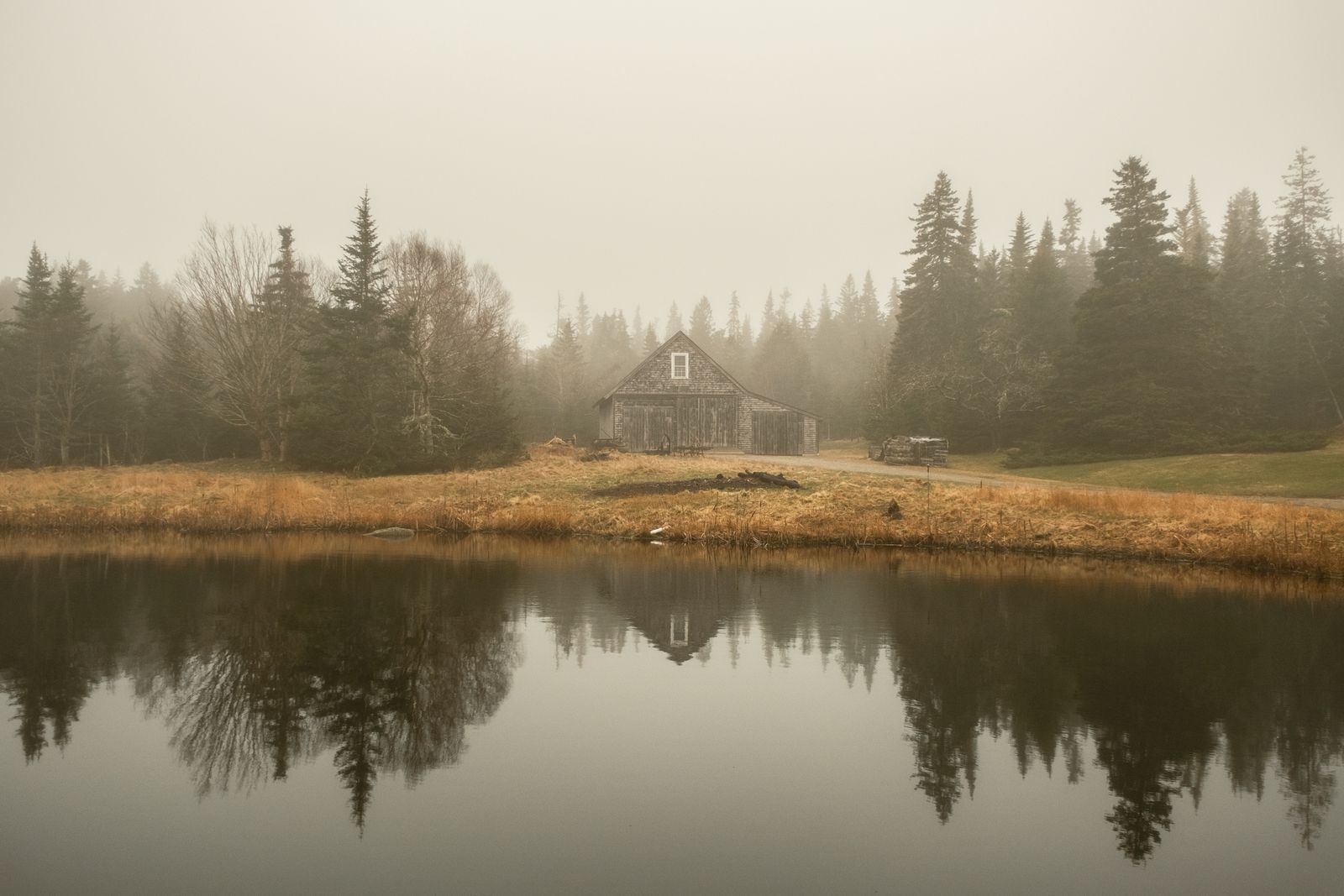 A barn reflecting in a pond on a foggy day on Beals Island, Maine