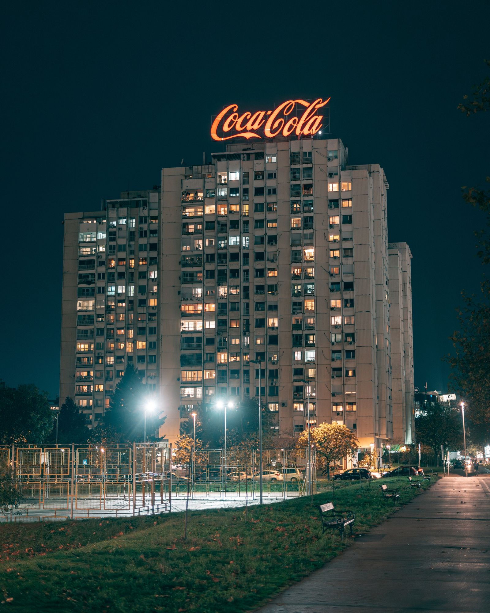 Blok 30 Coca-Cola sign at night in New Belgrade, Serbia