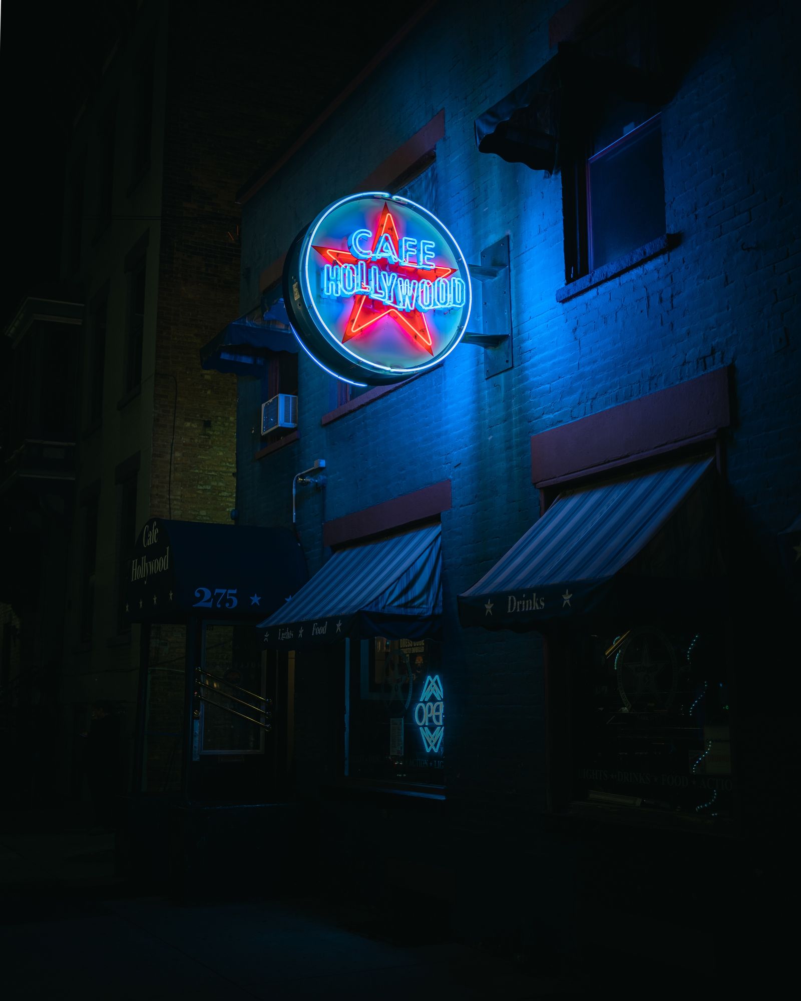 Cafe Hollywood neon sign at night, Albany, New York