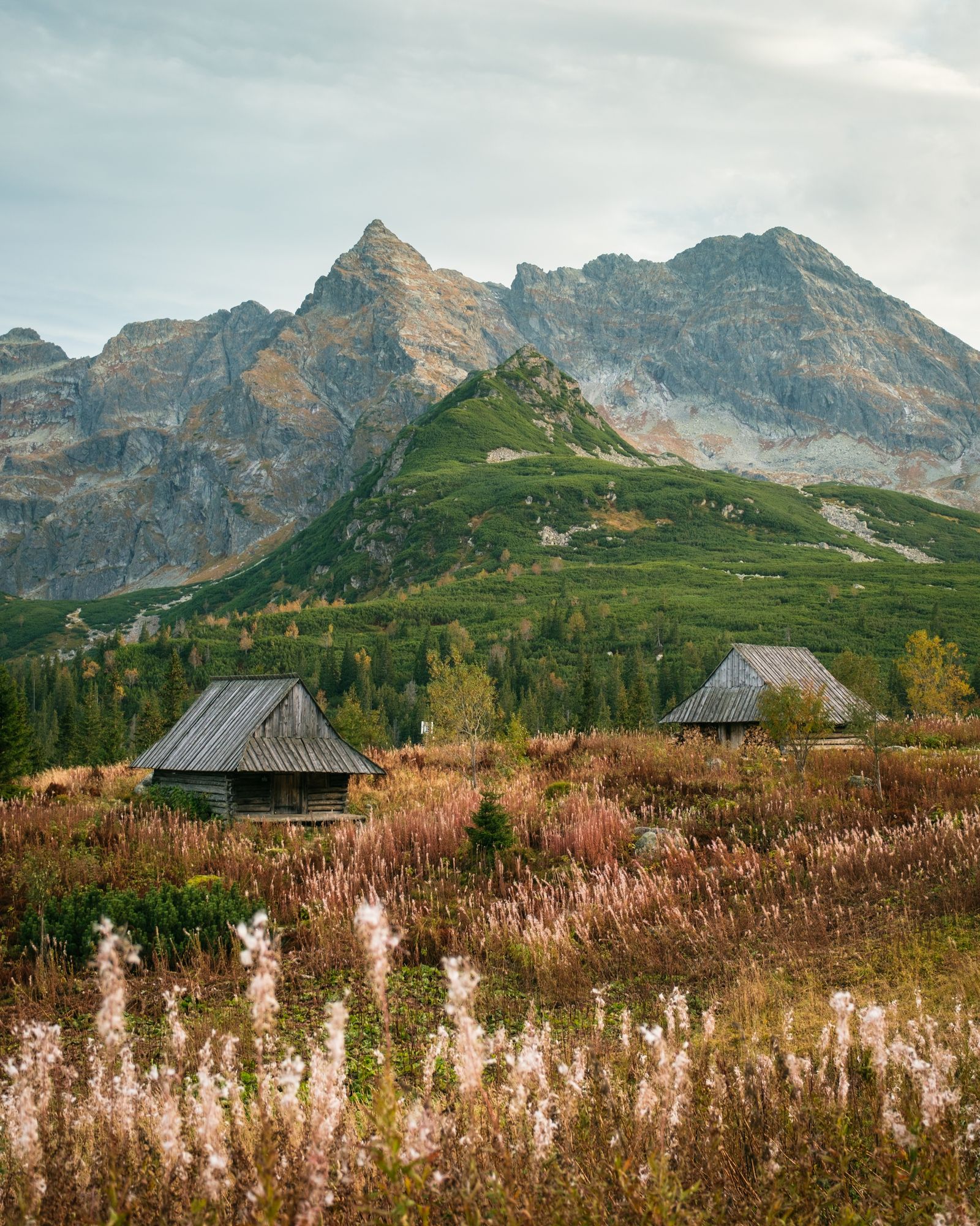 View of the Tatra Mountains and huts at Dolina Gąsienicowa, in Zakopane, Poland