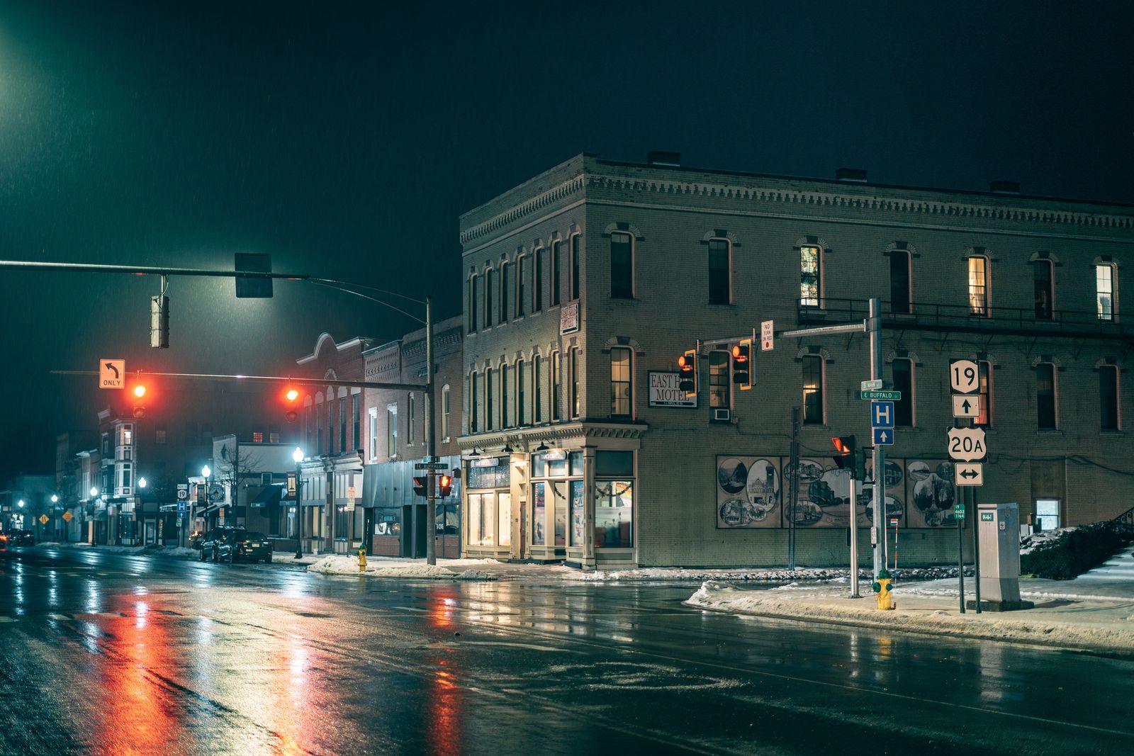 Street scene on a rainy night in downtown Warsaw, New York
