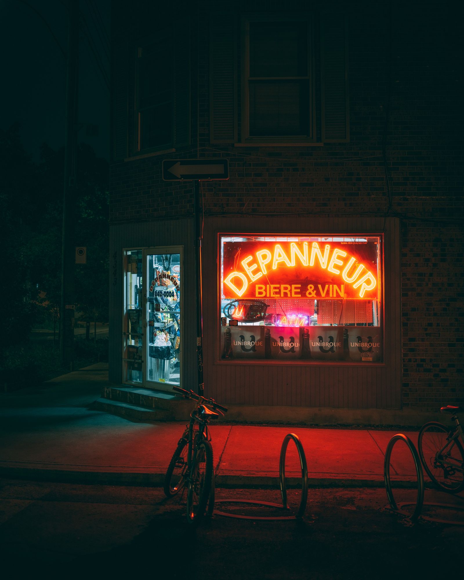 Dépanneur St-Dominique neon sign at night, in Le Plateau-Mont-Royal, Montréal, Québec, Canada