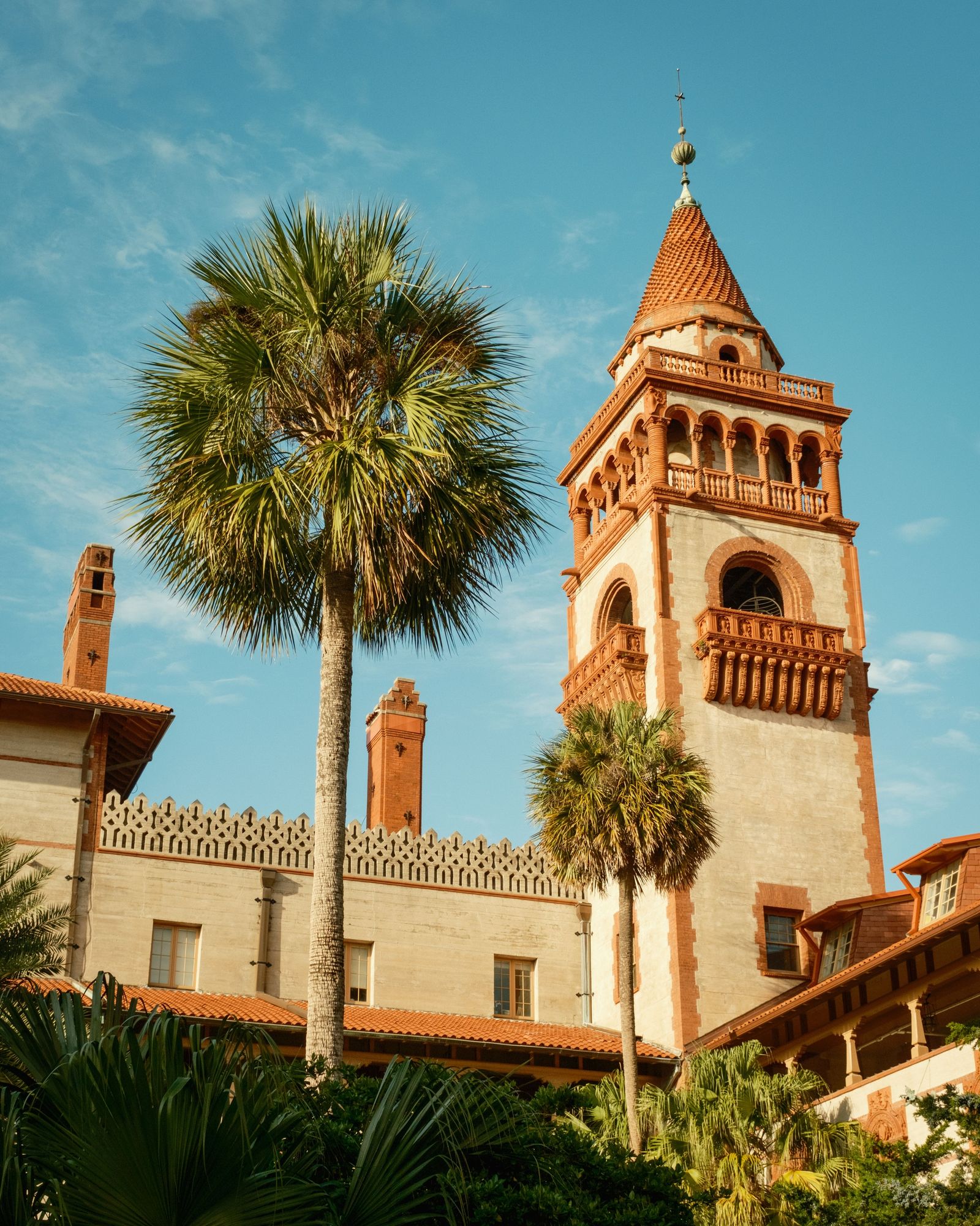 A historic tower and palm trees under a clear blue sky at Flagler College, St. Augustine, Florida.
