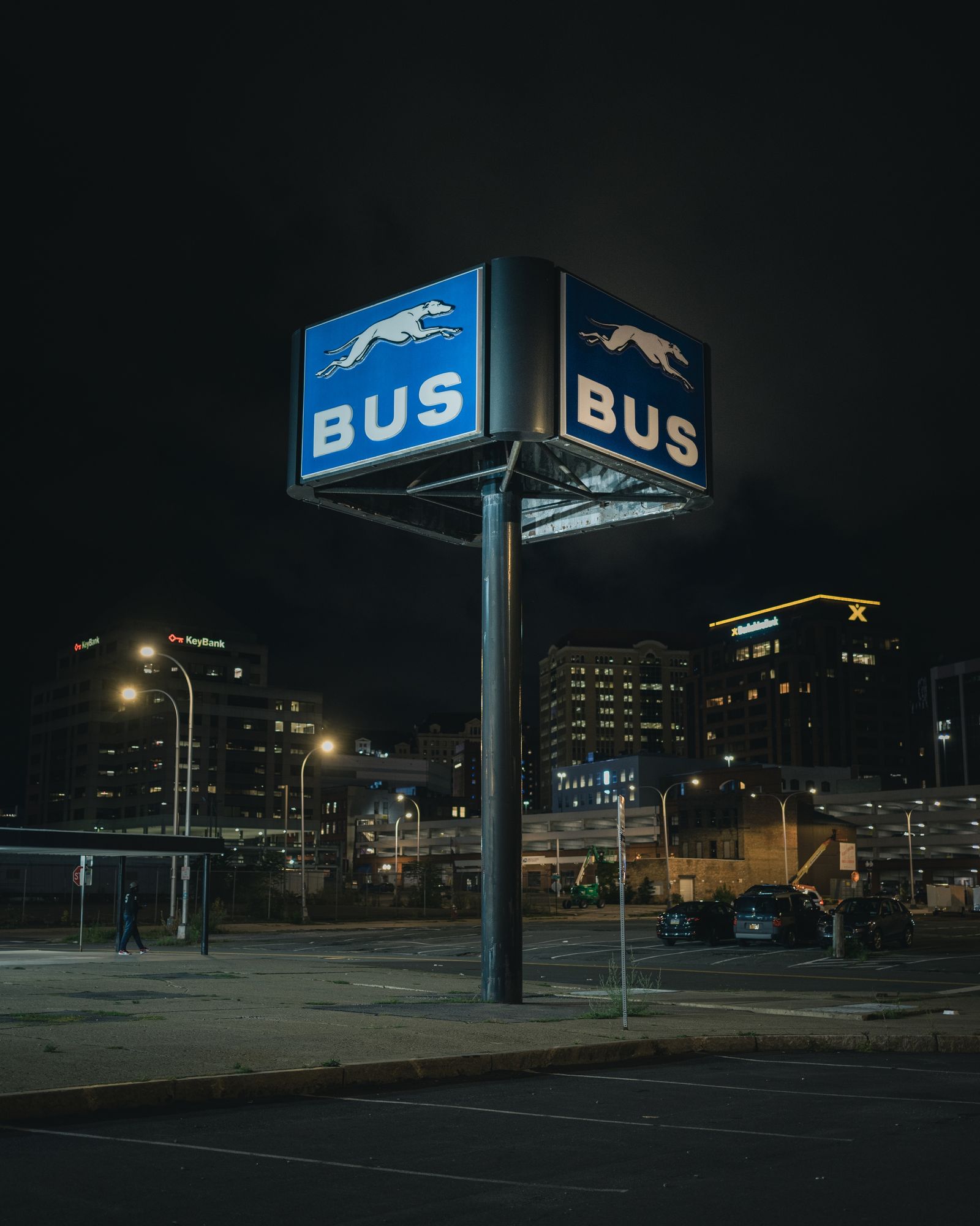 Greyhound Station sign at night, Albany, New York