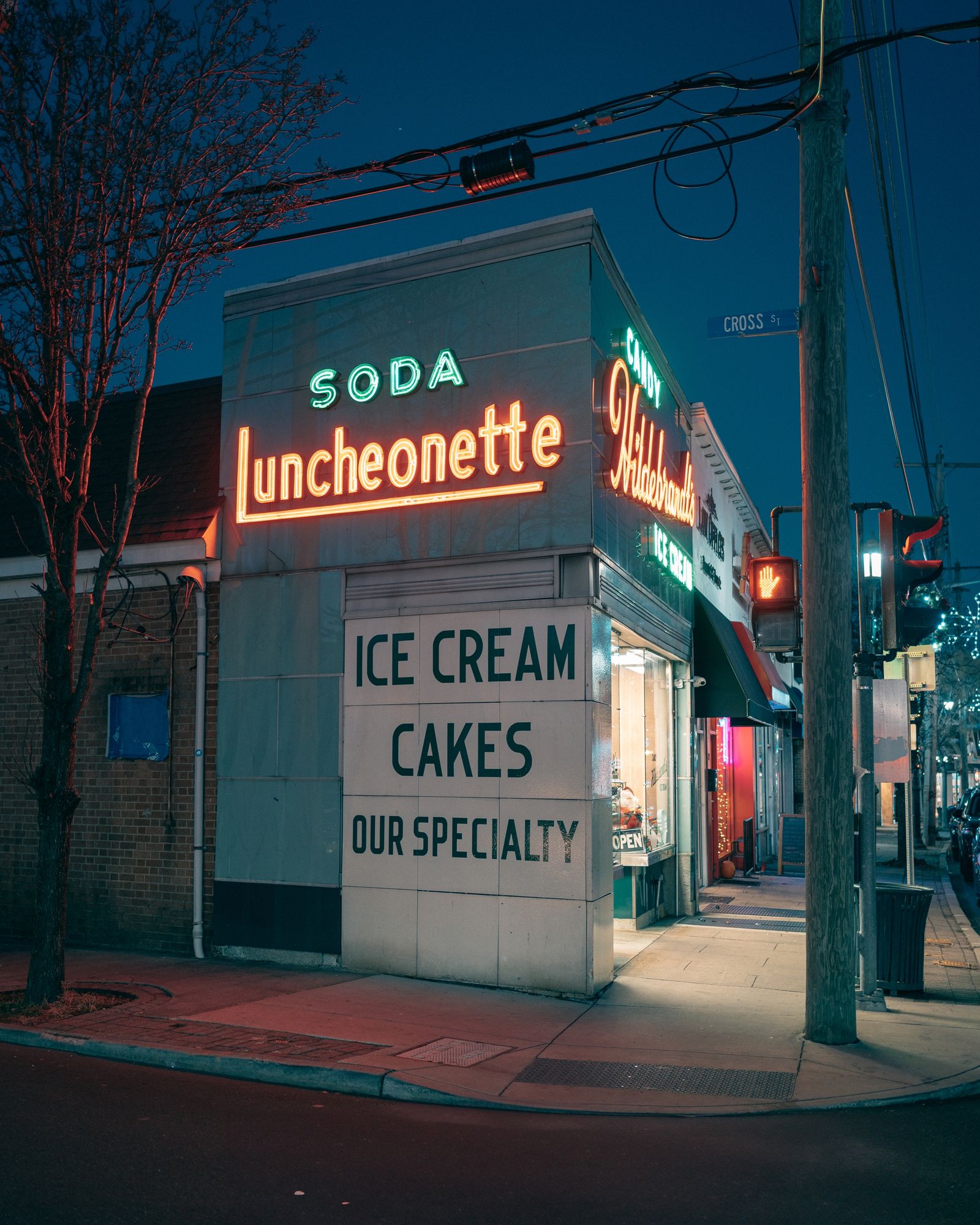 Hildebrandt's vintage neon sign at night, Williston Park, Long Island, New York