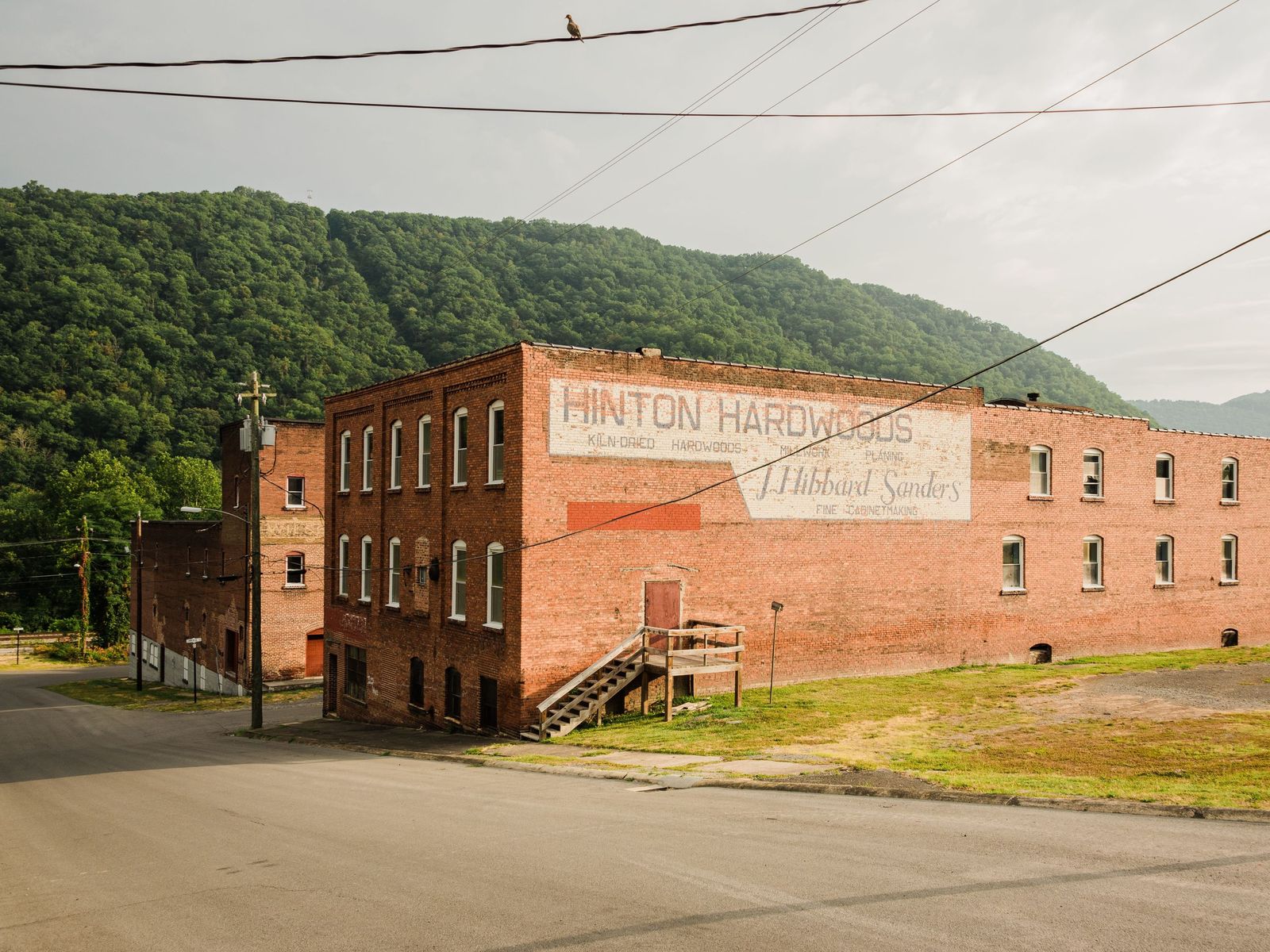 Old brick building with Hinton Hardwoods painted sign, in Hinton, West Virginia