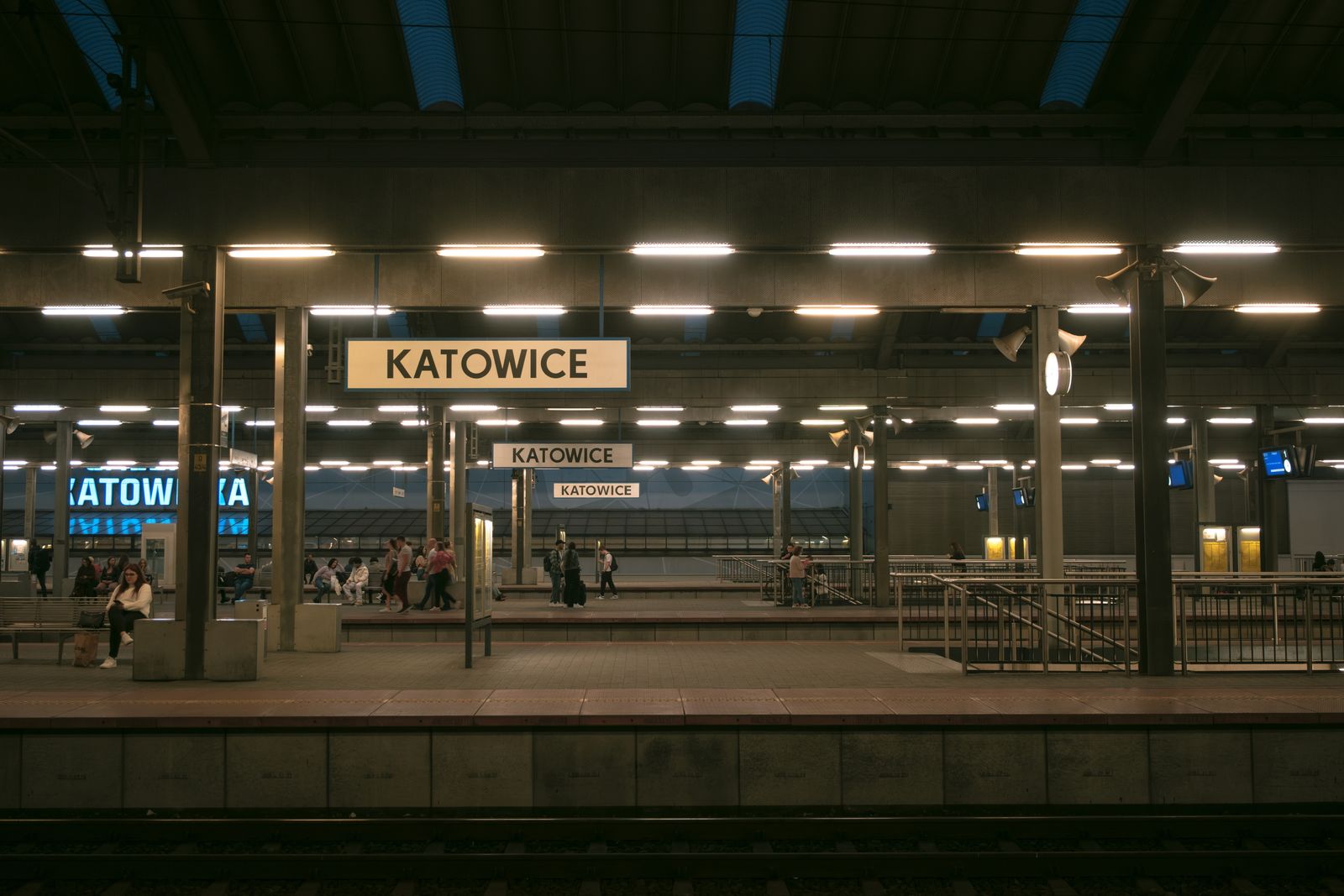 Platform of the train station at night in Katowice, Poland