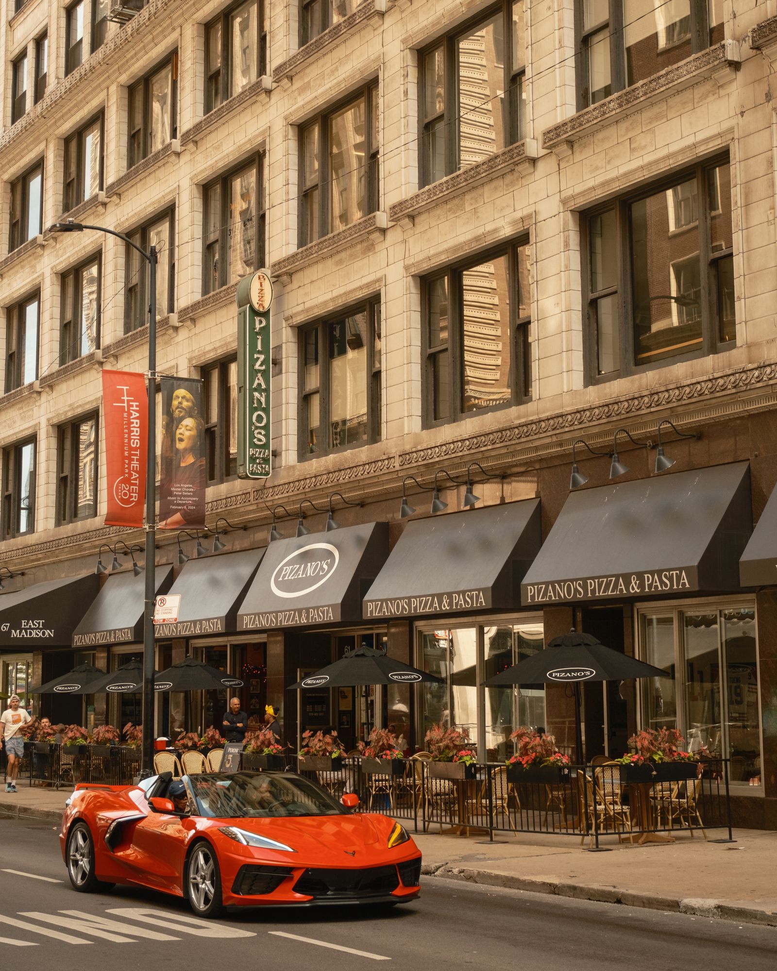 Red car and Pizano's Pizza on Madison Street in Chicago, Illinois