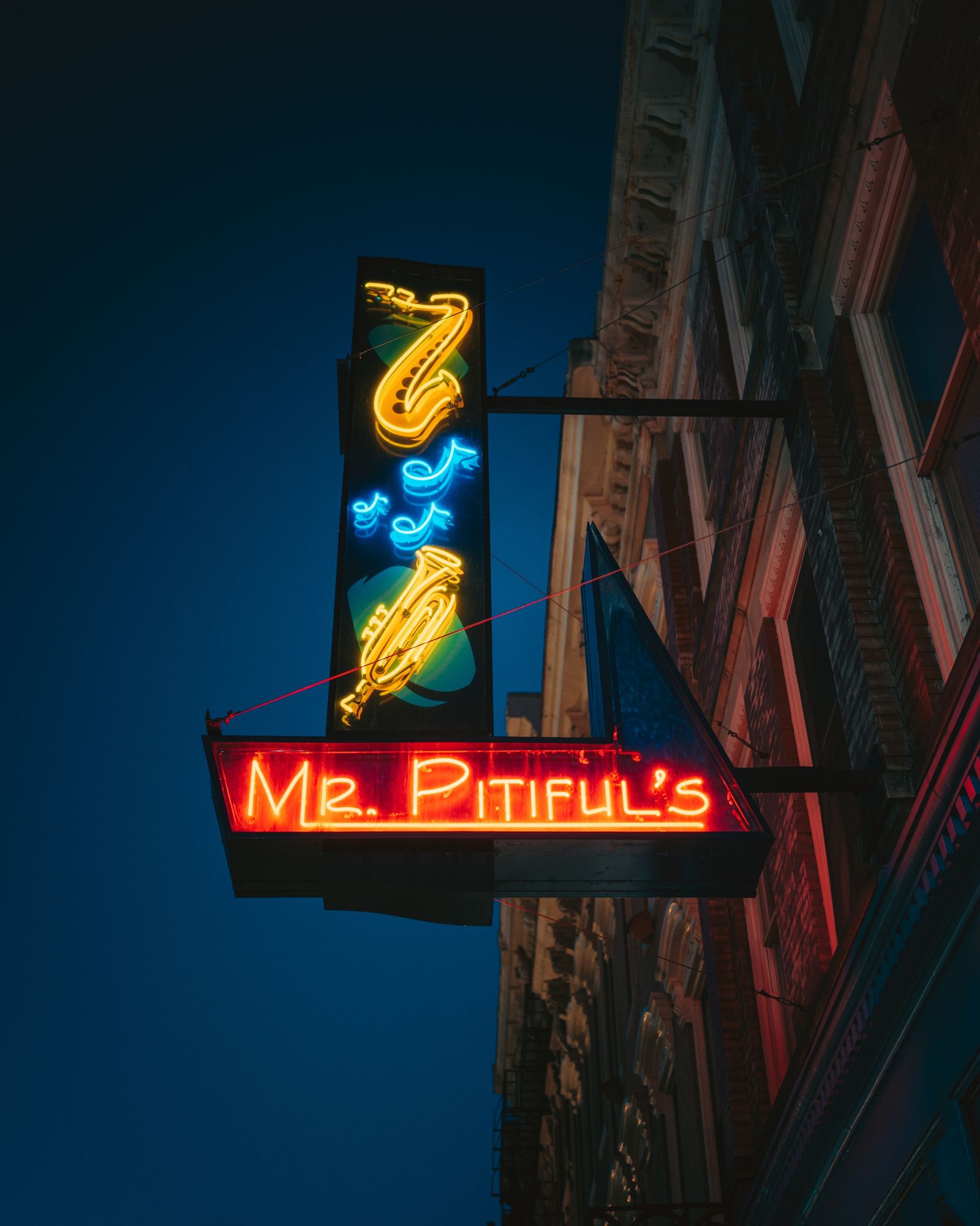 Mr. Pitiful's neon sign at night, in Over-the-Rhine, Cincinnati, Ohio
