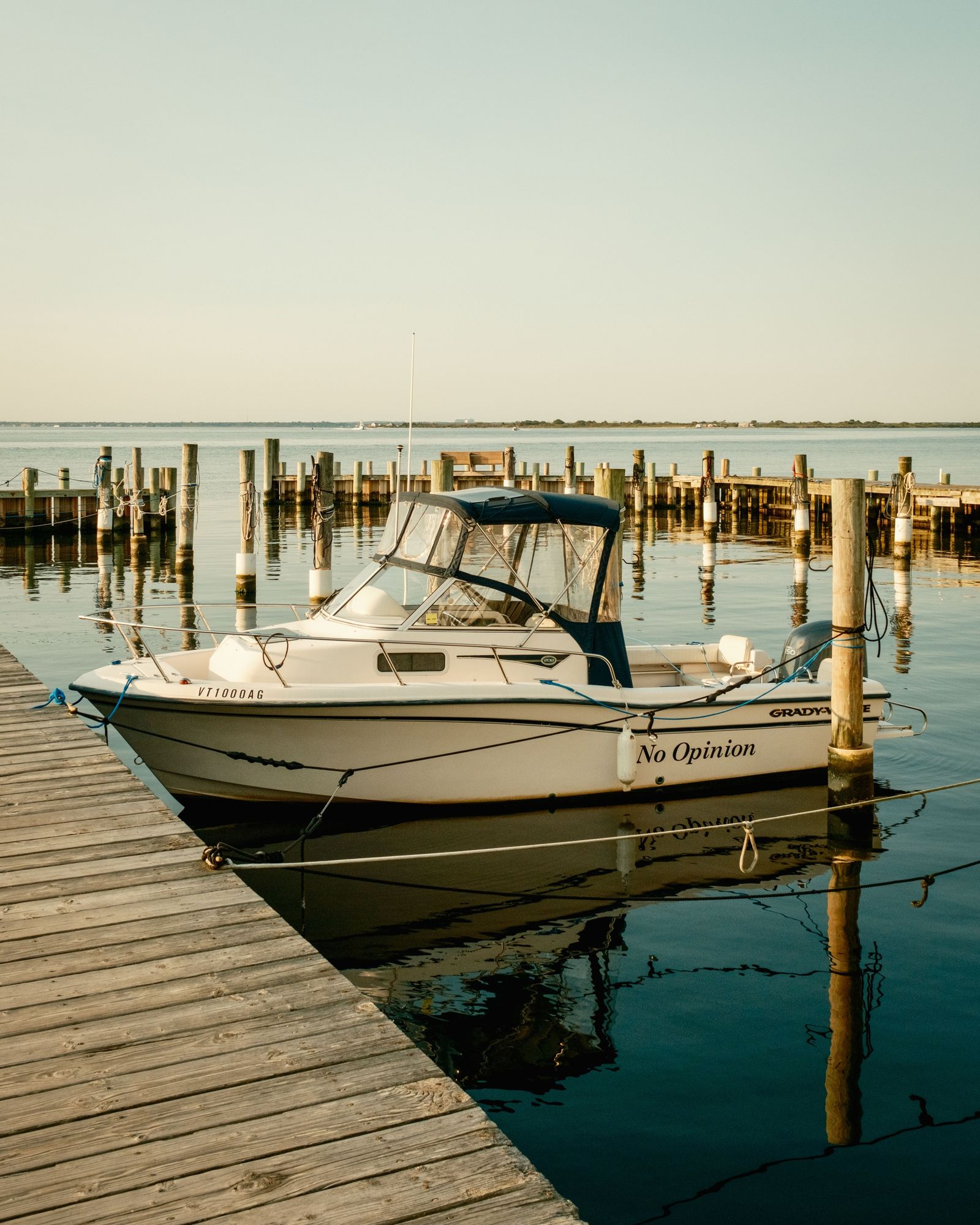 A boat called "No Opinion" in Kismet, Fire Island, New York