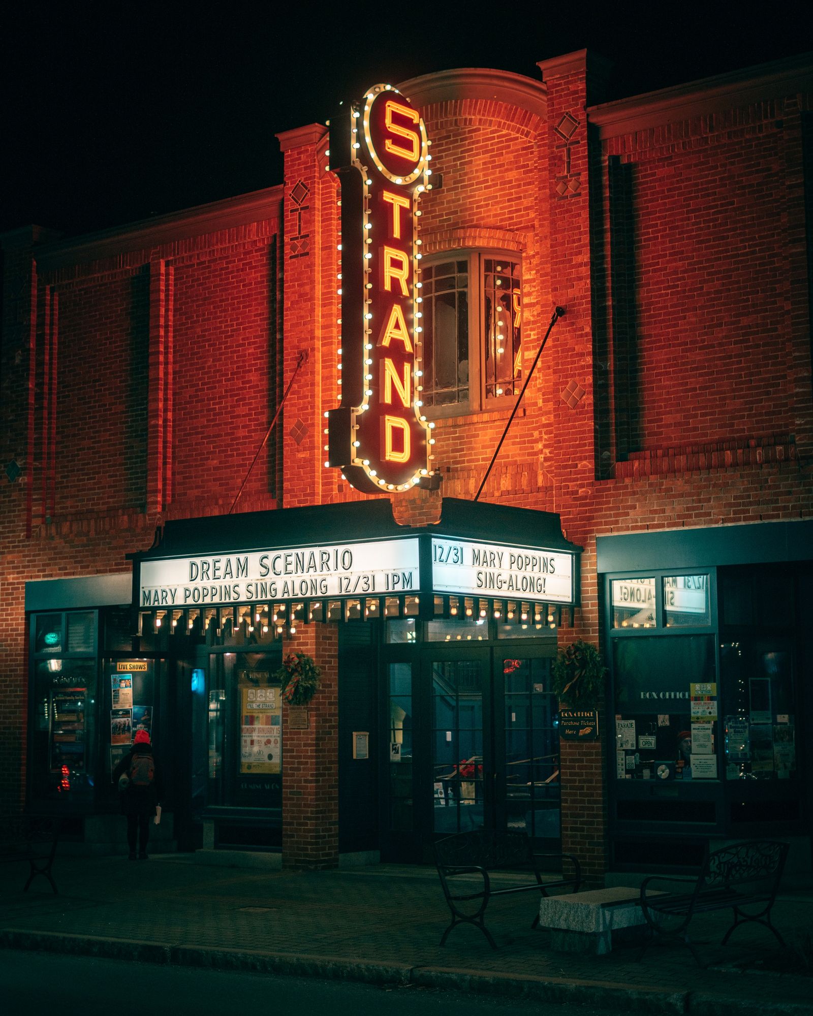 Strand Theatre vintage neon sign at night, Rockland, Maine